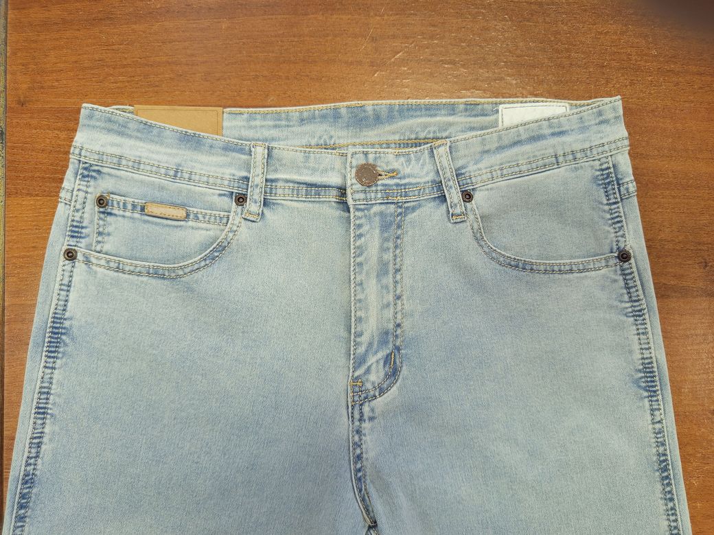 Светло-голубые летние мужские джинсы со стрейчем, состав 98% хлопок + 2% лайкра, посадка средняя, прямые, подужены книзу на 2 см, 5 карманов, цвет однотонный с эффектом потертости только вдоль швов, на поясе и гульфе. Модель отшивается только в универсальной 34 ростовке. Наличие уточняйте.