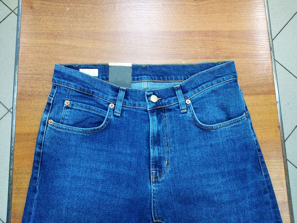 Темно-голубые мужские джинсы со средней посадкой и прямыми, чуть зауженными книзу брючинами, цвет с небольшим эффектом потертости, ткань средней плотности состава 99% хлопок + 1% лайкра, 5 карманов. Наличие уточняйте.