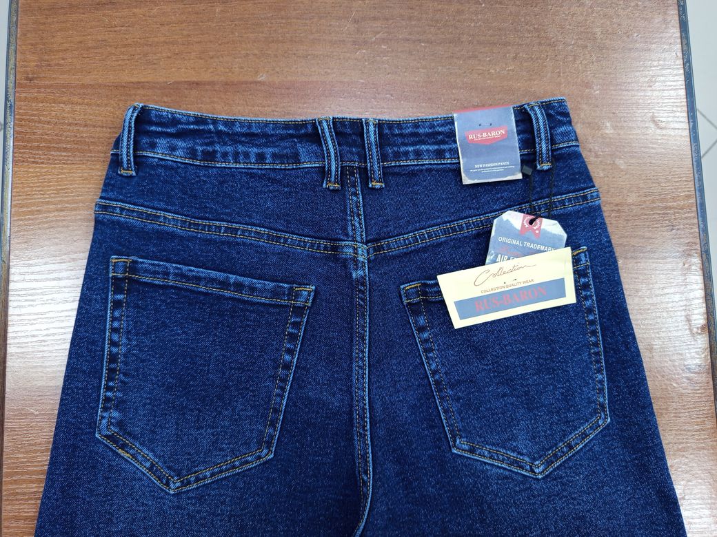 Мужские синие джинсы бананы с высокой посадкой, расширенными в бедре и колене и зауженными книзу брючинами, длина укорочена, ткань средней плотности, состав 98% хлопок + 2% эластан, 5 карманов, цвет однотонный с эффектом потертости только на поясе, гульфе и вдоль швов. Наличие уточняйте.