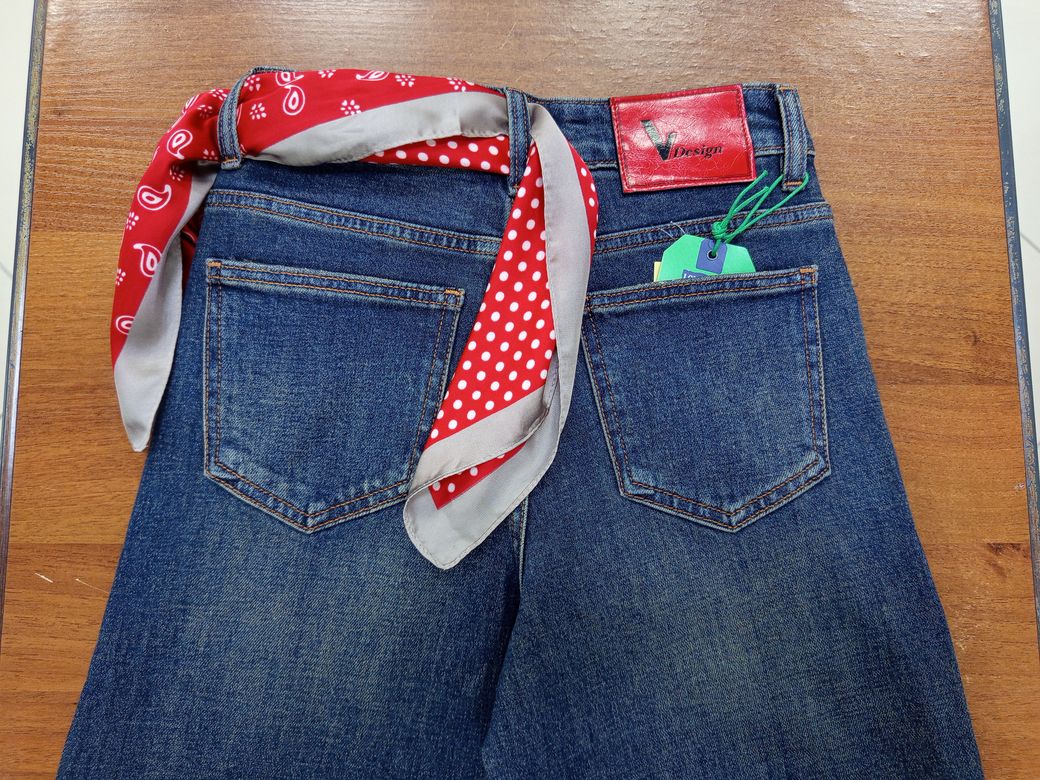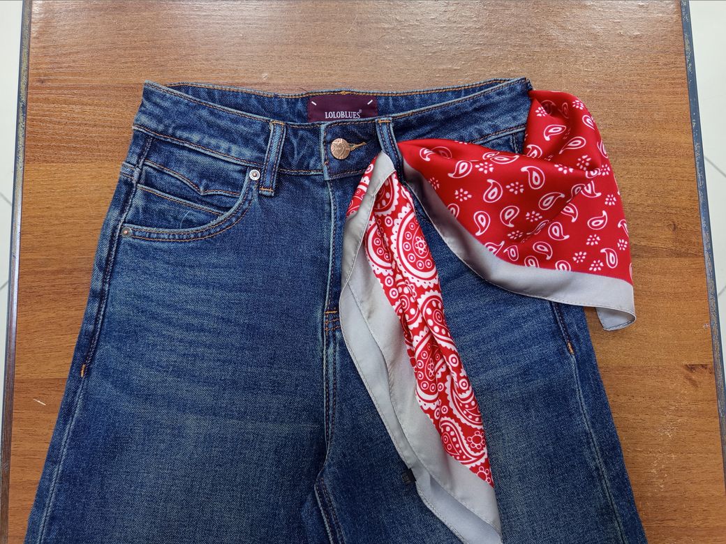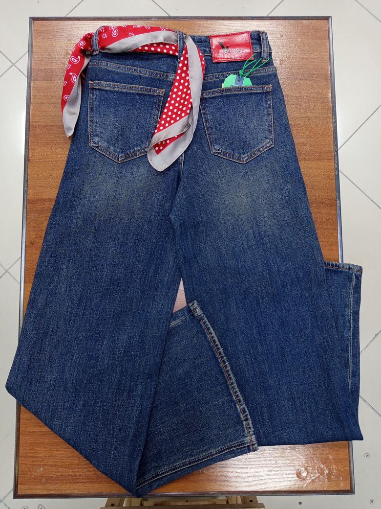 Широкие высокие женские джинсы-трубы с прямой от бедра брючиной, цвет синий с выраженным эффектом патиновой потертости, состав 98% хлопок + 2% эластан, 5 карманов, ростовка универсальная. Особенность: в подарок прилагается красная косынка. Наличие размеров уточняйте.