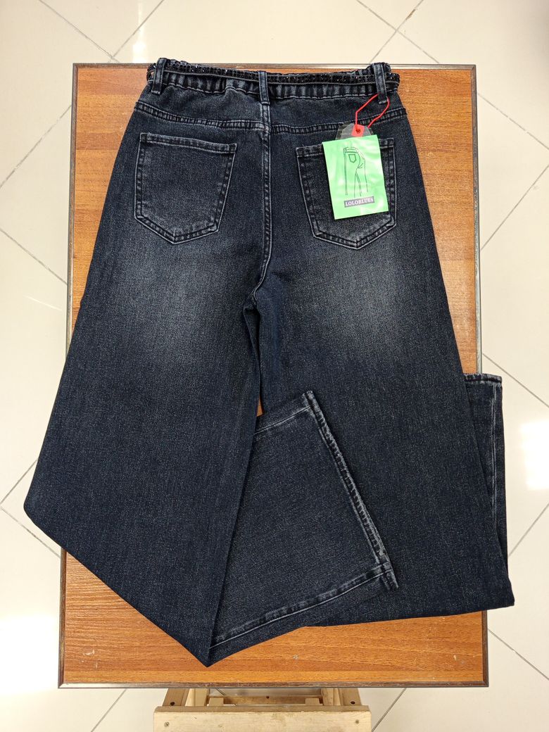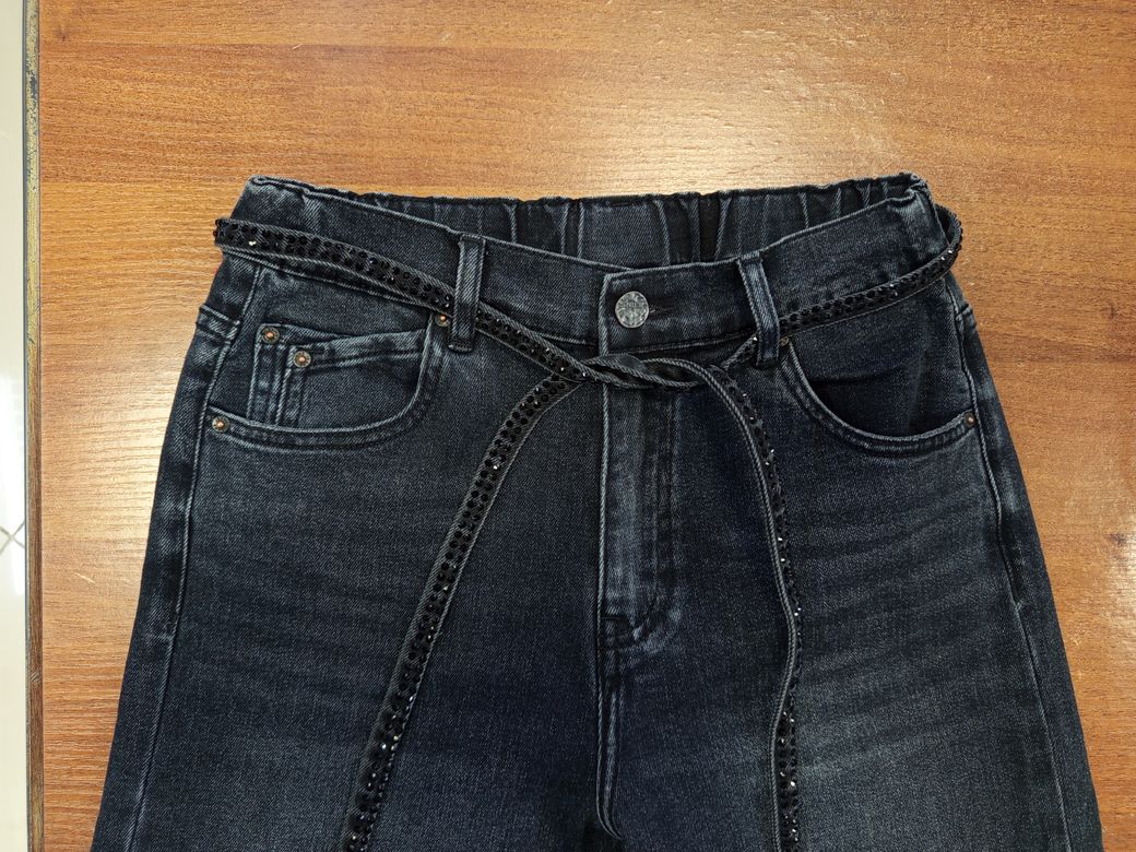 Темно-серые высокие широкие женские джинсы-трубы с прямой от бедра брючиной и резинкой в задней части пояса, цвет с небольшим эффектом потертости, ткань достаточно плотная, состав 98% хлопок + 2% эластан, 6 карманов (маленьких - два), ростовка универсальная, в комплекте текстильный пояс со стразами. Модель маломерит примерно на 2 размера. Наличие размеров уточняйте.