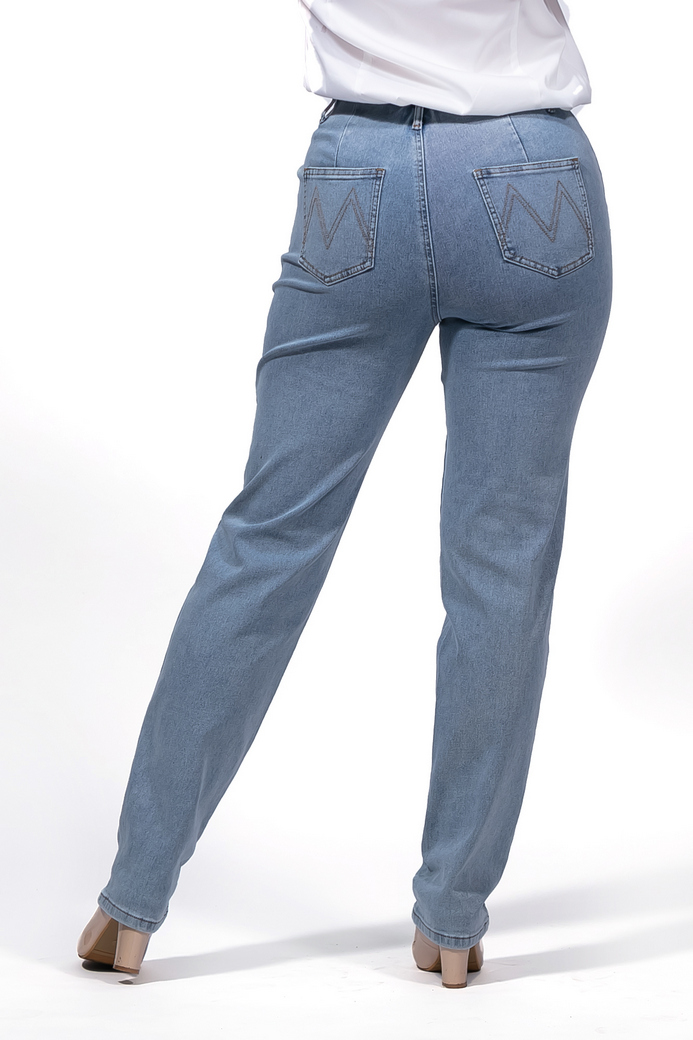 Женские голубые джинсы-бананы Монтана с высокой талией на кокетке без пояса, с необлегающими в бедре и колене и приуженными книзу брючинами, из облегченного денима состава 70% хлопок, 28% полиэстер, 2% спандекс, цвет однотонный с эффектом потертости только вдоль швов, на поясе и на гульфе, 4 кармана, передние косые. Особенность: спереди декоративная полукокетка, спереди и сзади вытачки. Модель не имеет ростовки, на невысоких будет в полную длину, на высоких - по щиколотки. Наличие размеров уточняйте, особенно перед приездом в магазин.