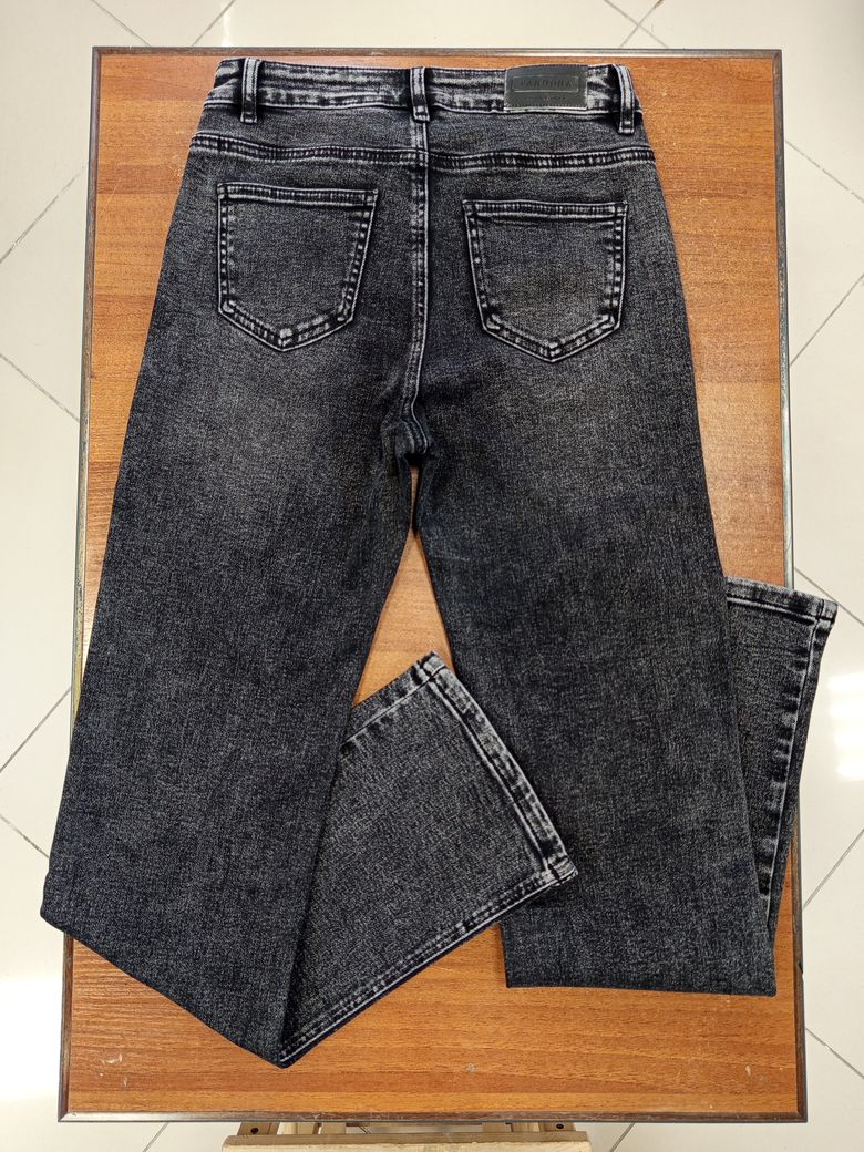 Темно-серые прямые женские джинсы со средне-высокой посадкой, цвет с небольшим эффектом потертости, ткань средней плотности, состав 85% хлопок + 13% полиэстер + 2% эластан, 5 карманов, ростовка универсальная. Наличие размеров уточняйте.