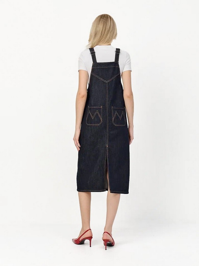 Черно-синий джинсовый сарафан на лямках из денима с добавкой шелка, крой прямой, немного трапециевидный, длина - миди, отстрочка светло-коричневой нитью, сзади разрез, состав 75% хлопок, 15% полиэстер, 10% шелк. Карманы: нагрудный с клапаном на пуговице на половину ширины, нижние накладные со скошенным входом, задние накладные прямые. Особенность: цвет с небольшим отливом; длина лямок регулируется с помощью металлических застежек. Наличие размеров уточняйте, особенно перед приездом в магазин.